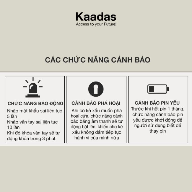 Khóa cửa tân cổ điển Kaadas 6002 còn được trang bị cảnh báo khi có lực tác động vào thân khóa và tự động khóa khi nhập sai mật khẩu quá 5 lần. Khi pin yếu, khóa sẽ phát ra cảnh báo để người dùng kịp thời thay pin.
